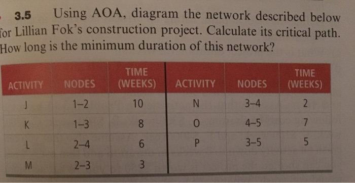 Textbook Solutions Expert Tutors Earn. 37 TIME TIME WEEKS WEEKS ACTIVITY NODES NODES ACTIVITY 3-4 10 1-2 4-5 1-3 3-5 P 2 4 M 2-3. Calculate its critical path.